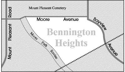The Bennington Heights neighbourhood is situated on a flat plain of land, on the crest of an escarpment which thousands of years ago had been part of the shoreline of ancient Lake Iroquois - the forerunner to Lake Ontario. This area was first settled in the 1870’s by John Cudmore and Daniel Ryan, who operated successful market gardens on their respective properties. The Cudmore farm was subdivided for residential development in 1889 and later re-subdivided in 1912. Daniel Ryan’s property, which was located just to the north of the Cudmore farm was subdivided in stages between 1891 and 1946. The first resident of the present day neighbourhood was Thomas Weatherhead, a solicitor for the East York School Board. In 1925, when Weatherhead purchased number thirty Rosemount Avenue he had the Rosemount street name changed to Bennington, which was his wife’s maiden name. The Bennington name was also adopted by the Bennington Heights School when it opened in 1950. This neighbourhood has been referred to as Bennington Heights ever since.