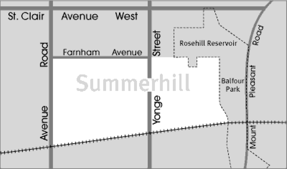 The Summerhill neighbourhood is named after ‘Summer Hill’ house, a magnificent Regency cottage built in 1842, by transportation baron Charles Thompson. Summer Hill stood on the crest of the hill where the houses on Summerhill Gardens are located today. Thompson’s two hundred acre Summer Hill estate stretched from the present day Yonge Street to Mt. Pleasant Road. On this site Thompson established the ‘Summer Hill Spring Park and Pleasure Grounds’. This amusement park featured rides, games, swimming and a popular dance pavilion that was located inside the Summer Hill house. Thompson’s heirs subdivided Summer Hill in the 1860’s. From the 1880’s onward Summerhill’s development revolved around the railway. The first residents of this neighbourhood worked at the North Toronto Railway station which was established on Yonge Street near Summerhill in the 1880’s. This station - rebuilt in 1916 - is distinguished by its grand clock tower and now serves as the neighbourhood liquor store. In the 1920’s the Canadian Pacific Railway made Summerhill their main Toronto station. When Summerhill station closed this neighbourhood went into a period of decline that lasted until the Summerhill subway station opened in 1965. Summerhill has enjoyed a position of prominence among Toronto neighbourhoods ever since.