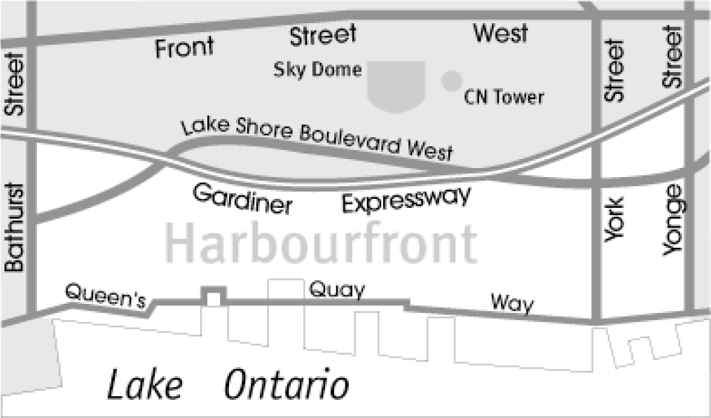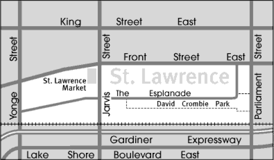 The land on which the St. Lawrence neighbourhood is built was originally part of the shoreline of Lake Ontario. Immediately to the north of here, above Front Street, was the Town of York, the forerunner to the City of Toronto. The site of the present day St. Lawrence neighbourhood was created from landfill in the early 1800’s. It was originally intended to serve as a public promenade with a grand Esplanade along the waterfront. However the city turned the land over to the railways, which in turn attracted industry to the St. Lawrence area. By the early 1900’s, St. Lawrence had become one of Toronto’s most prominent industrial centres. It remained a vital industrial area until the late 1940’s, when Toronto’s industrial base began moving outside of the city. Consequently, St. Lawrence went into a period of decline which lasted until the 1970’s, when Toronto politicians made the decision to create the present day St. Lawrence neighbourhood.